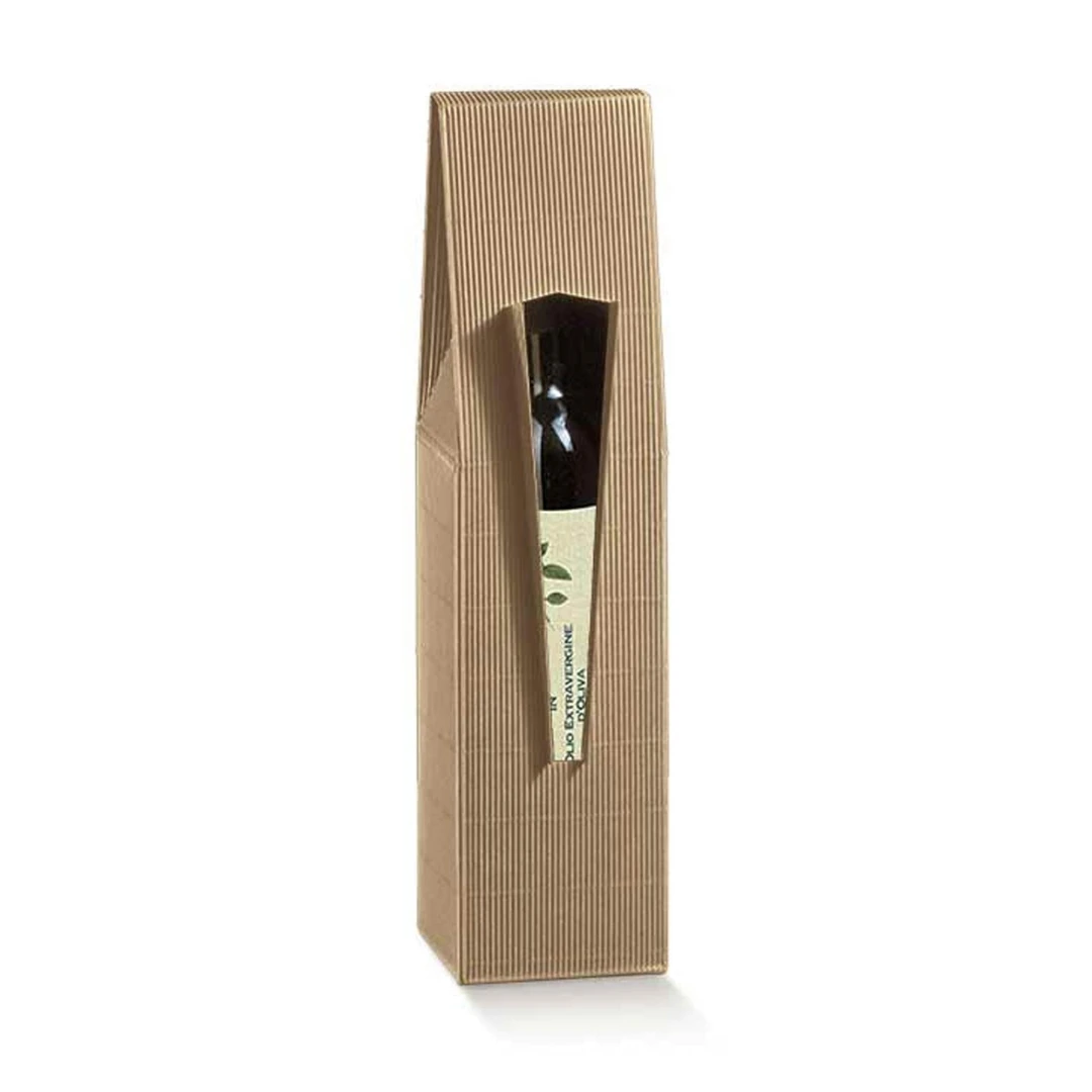 Scatole per bottiglie e Bomboniere gastronomiche in Cartone effetto onda rustico marrone, scatole portabottiglie a prezzi stock da ingrosso, sia piccole mignon per olio liquore limoncello grappa che grandi per le bottiglie di vino prosecco e champagne.