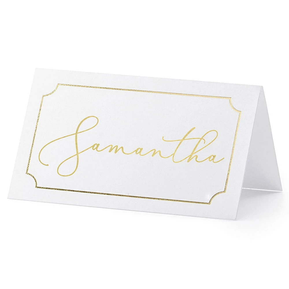 Segnaposto Economico in cartoncino bianco e cornice oro, per dare un tocco in più alla tua cerimonia, misura 10x5 cm, il prezzo si riferisce alla confezione da 10 pezzi (non comprensivo di stampa).