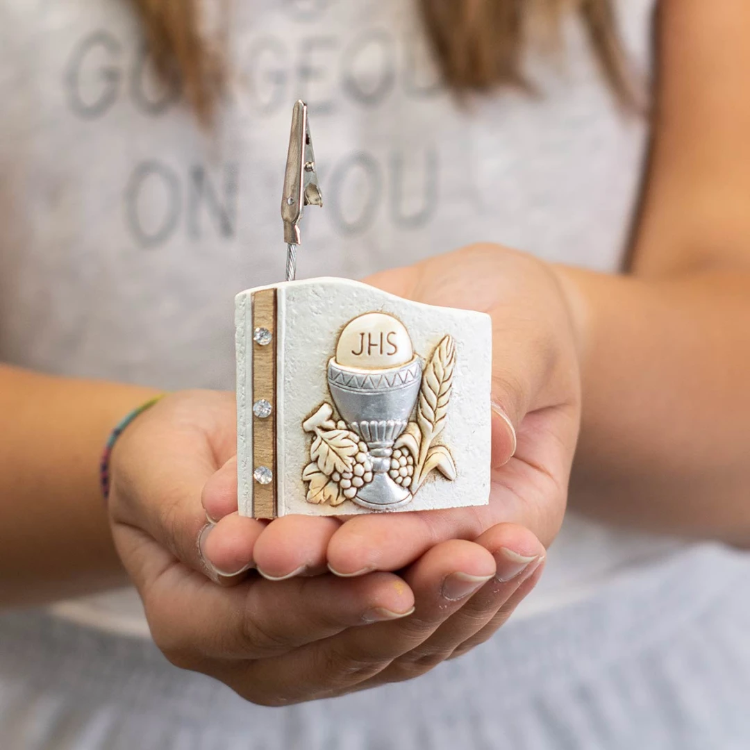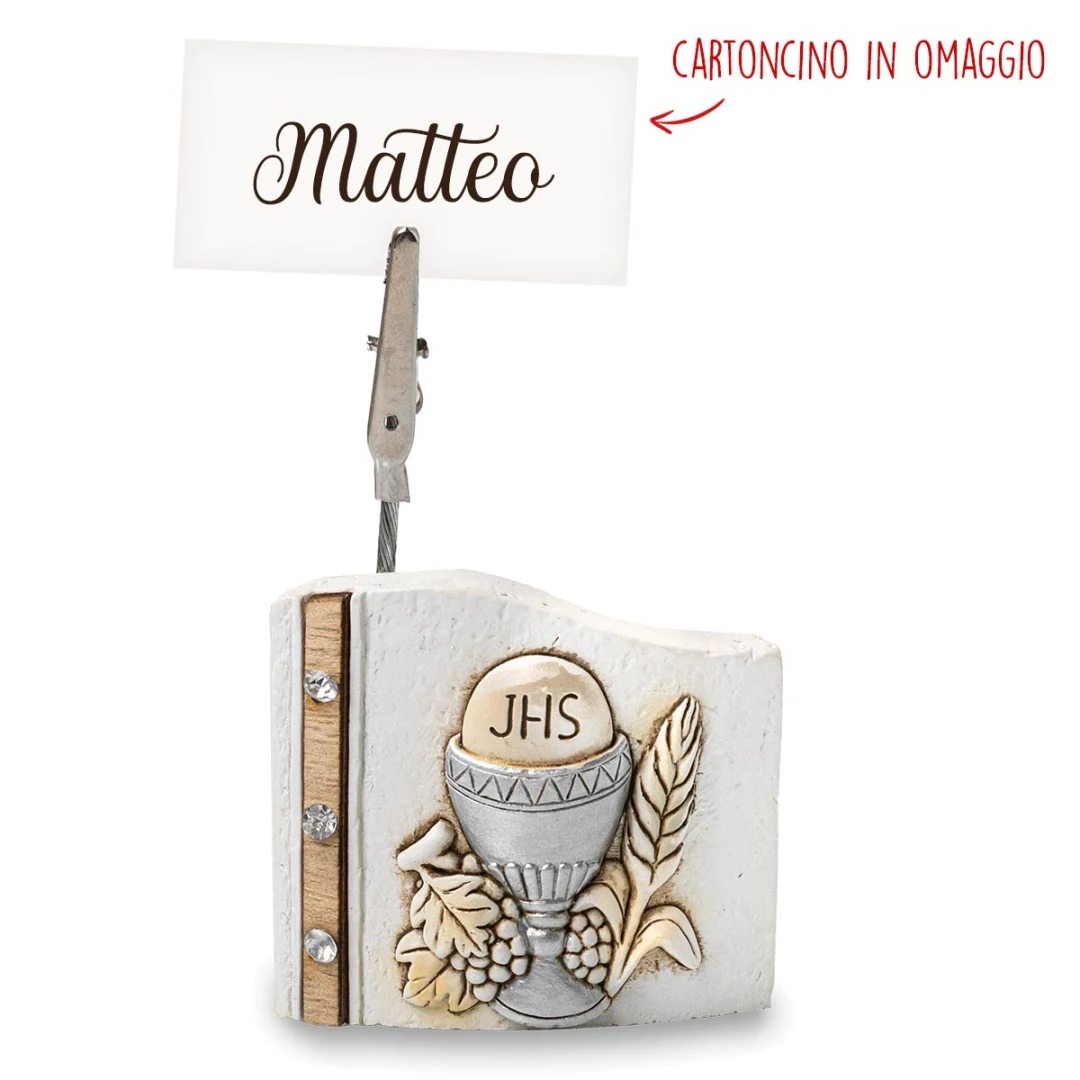 segnaposto comunione, icona con simbolo calice prima comunione e clip porta bigliettino dove scrivere il nome, cartoncino in omaggio, materiale resina decorata a mano, misura 6x8x1 cm.