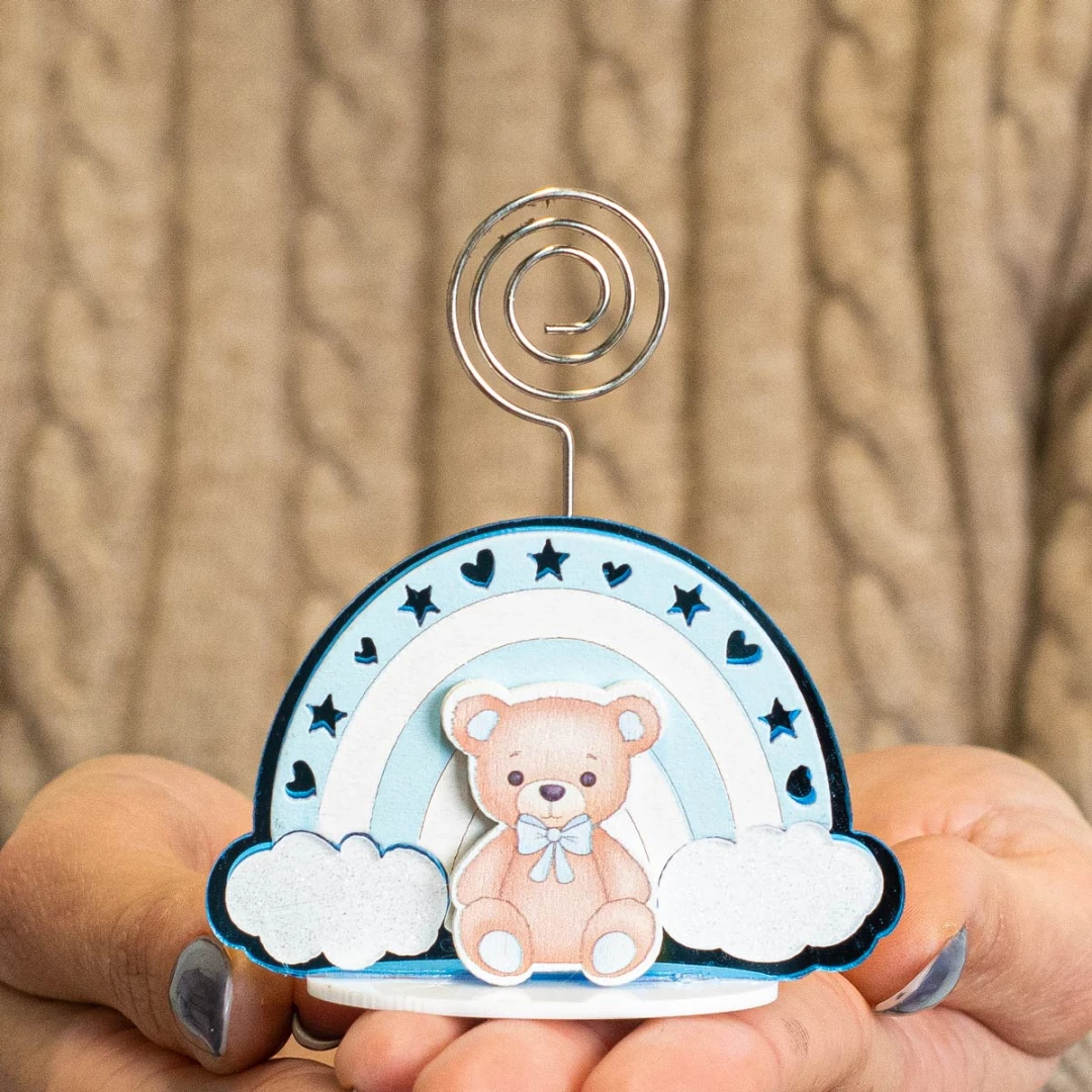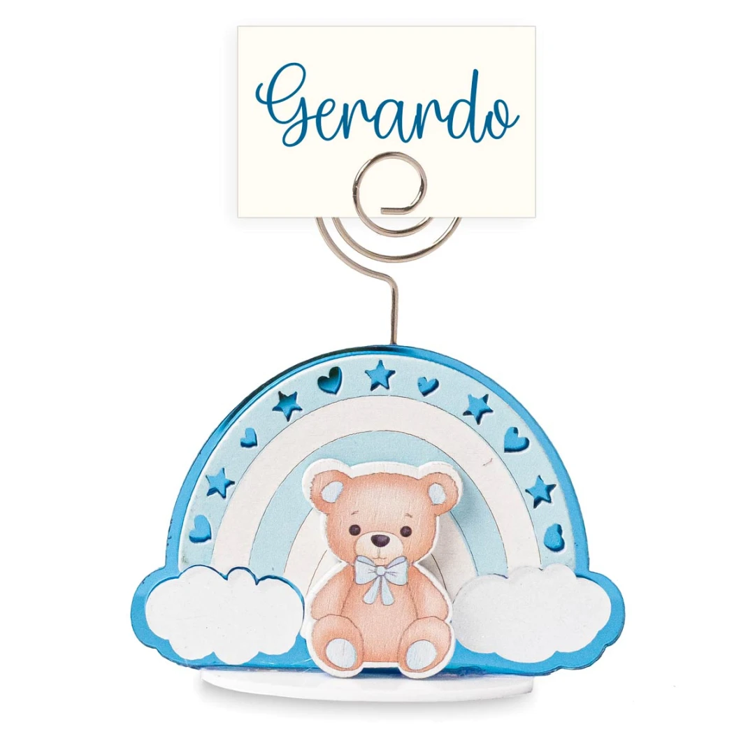 Bomboniere Battesimo e Nascita Bimbo, Linea Baleno, Clip Segnaposto sulle tonalità del celeste in legno con dettagli glitterati orsetto e arcobaleno con nuvolette. Prezzo cadauno. Prodotto Artigianale. 7,5 x 2,5 cm | h 8,5 cm. Cartoncino Omaggio.