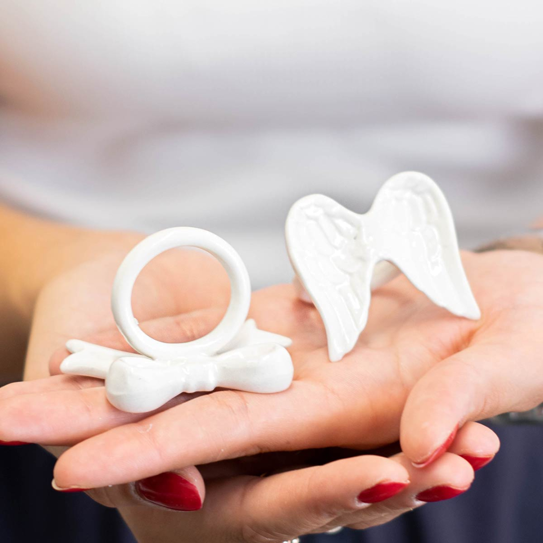 OFFERTISSIMA idea bomboniera o segnaposto, elegante portatovagliolo in ceramica bianca, scegli il modello tra Cuore, Fiocco e Ali, adatto per ogni cerimonia, misura 5x4 cm