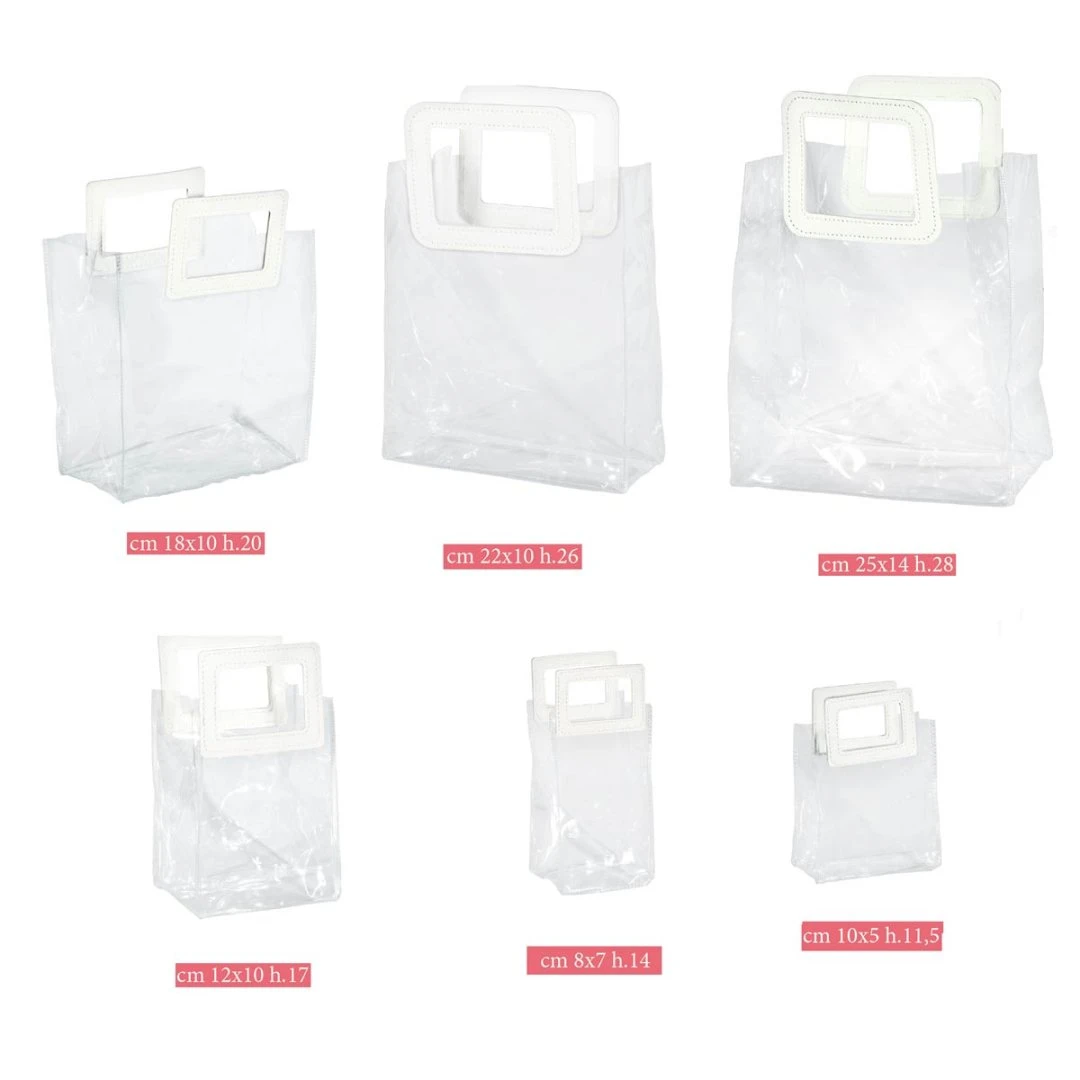 Scatole in PVC con manico in ecopelle bianco, ideali per bomboniere da matrimonio, battesimo, nascita e tutte le altre cerimonie. Prezzo cadauna.