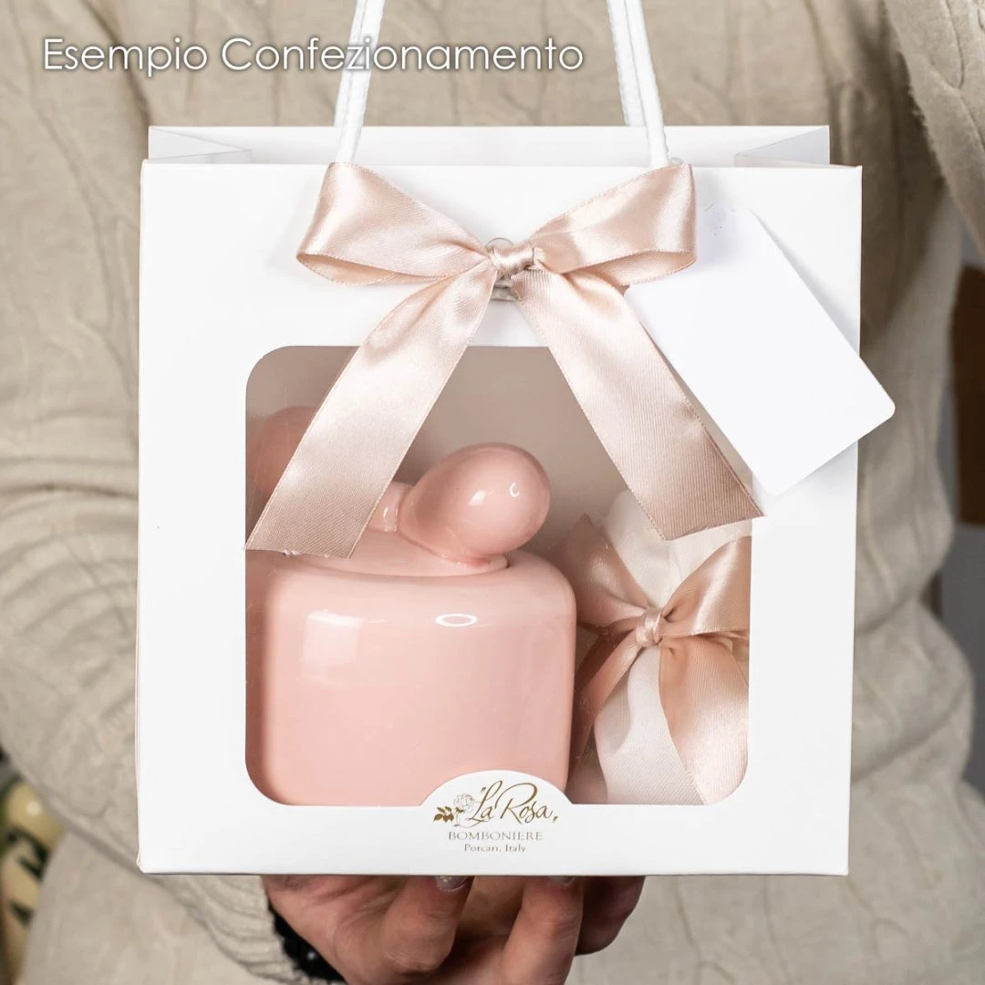 Shopper per bomboniere La Rosa in elegante cartoncino bianco con logo oro, perfetta per valorizzare e presentare al meglio ogni confezione. Dotata di finestra in PVC frontale che lascia intravedere il contenuto e manici in tessuto (cordino) resistenti e raffinati.