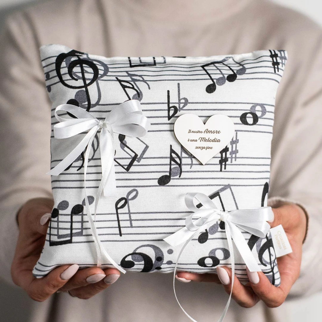 Cuscino portafedi matrimonio Tema Musica in cotone con spartito musicale, cordini e cuore con frase incisa. prodotto made in italy, realizzato in sartoria, misura 20x20 cm.