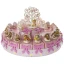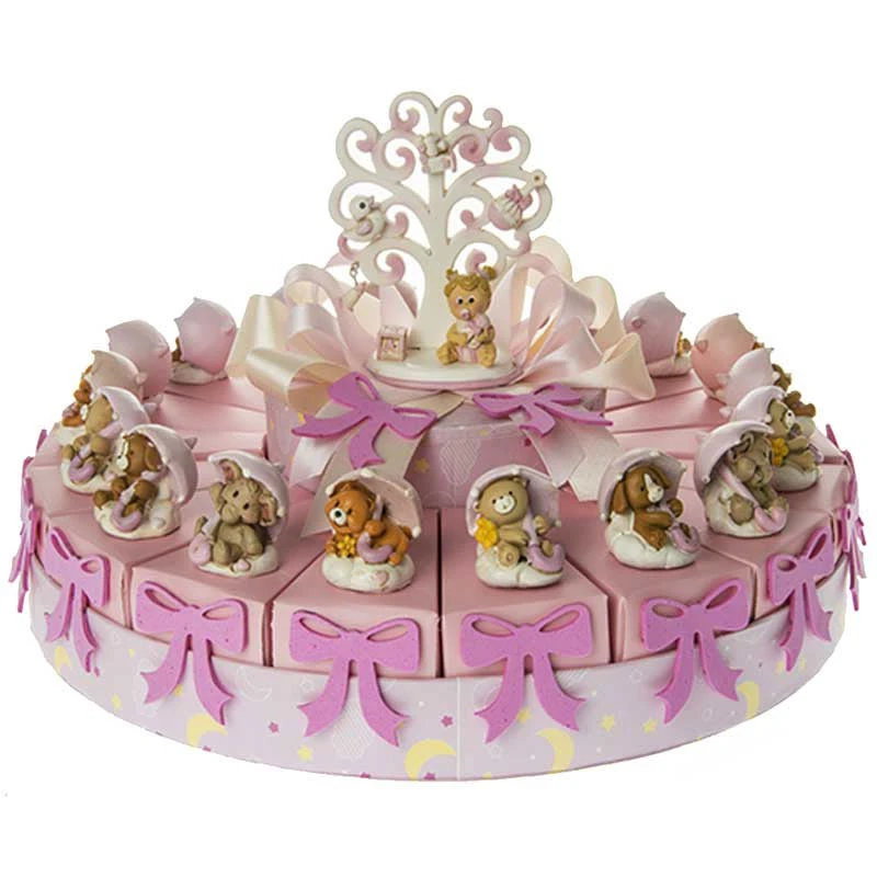 Torta Bomboniere Battesimo e Nascita Bimba, completa di animaletti rosa su ogni fetta, albero della vita grande centrale, nastri e struttura. misura 33 cm.