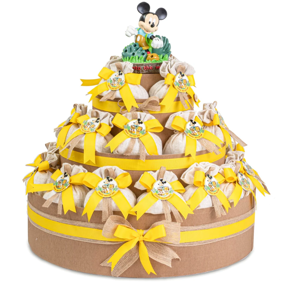 Torta di Bomboniere Disney adatta a battesimo e comunione maschio, con 20 sacchettini portaconfetti con magnete Topolino con leoncino nella giungla, completo di struttura decorata con fiocchi, sacchetti, 5 confetti alla mandorla, bigliettino stampato, inoltre il tutto coronato da una splendida lampada centro torta di Mickey a LED che rimarrà al festeggiato!