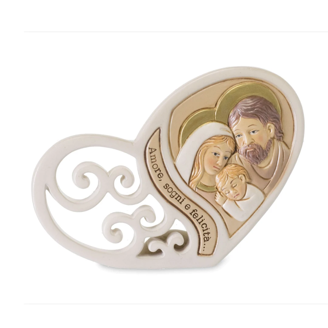 Ultimi 9 pezzi bomboniere cuore in resina con frase " Amore, Sogni e Felicità... " e simbolo della Sacra Famiglia. Misurano 11 cm